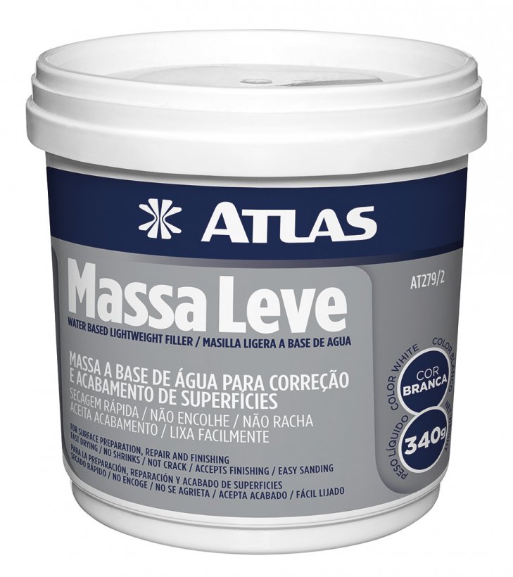 A Massa Leve Atlas é à base d’agua, extremamente leve, destinada à correção de imperfeições e nivelamento de superfícies, pequenas rachaduras, sulcos em paredes, entre outros. Serve ainda para outras aplicações onde exista a necessidade de calafetação. Este produto não quebra, não racha, seca rápido, é fácil de aplicar e pronto para usar. Além disso, não é irritante, não apresenta solventes além de água, possui cor branca que pode ser pigmentada e está disponível em duas embalagens, com 90g e com 340g.