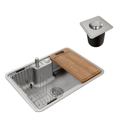 1 Cuba, 1 Manual (Gabarito), 1 Válvula de saída d'água 4,5", 2 Tampão, 1 Conjunto fixação embutir, 1 Conjunto fixação sobrepor, 1 Sifão extensivel 72 cm, 1 Dispensador de sabão, 1 Tábua de corte, 1 Cesto aramado escorredor, 1 Lixeira de embutir quadrada 5L.