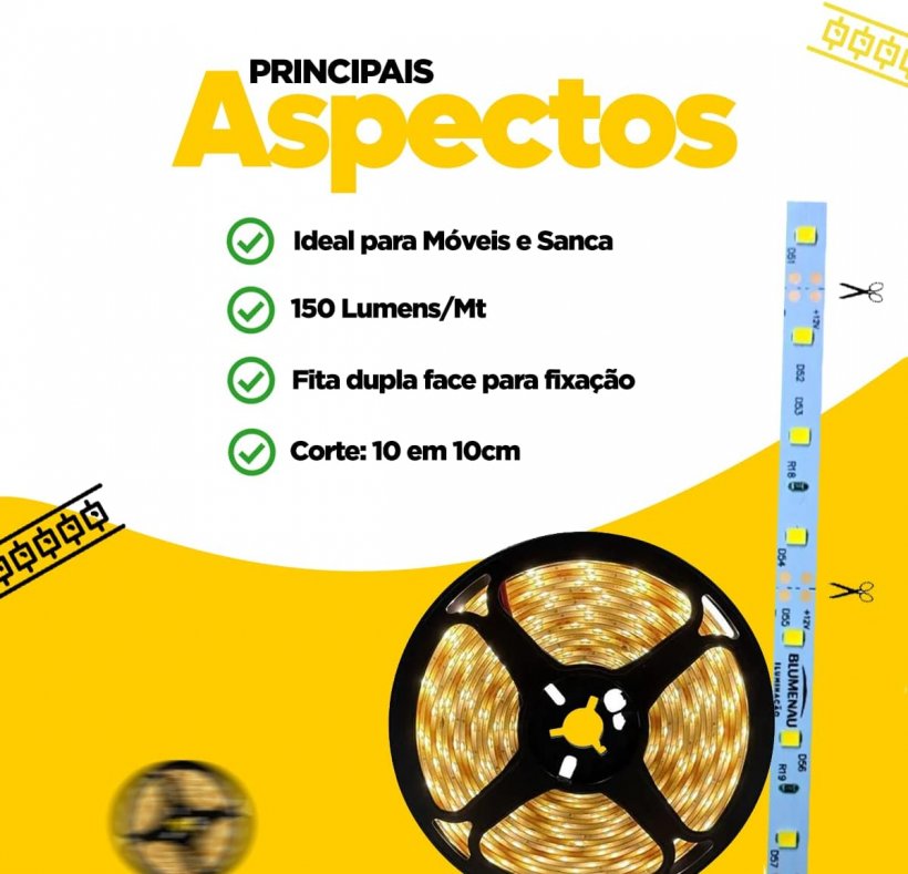 Fita de LED 5m da Blumenau Iluminação é para quem busca iluminação decorativa no ambiente de modo prático, simples e eficiente. Possibilita iluminar o interior de móveis, sancas de gesso e criar marcações em diversos espaços, deixando-os personalizados e modernos.