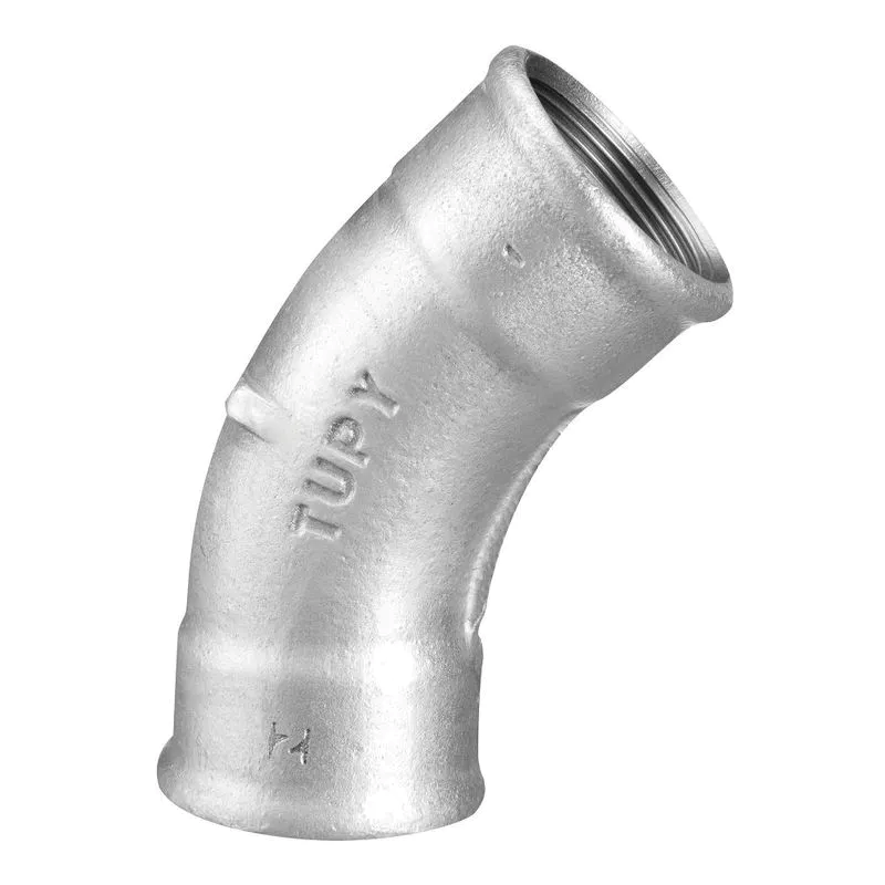 É uma conexão em ferro maleável projetada para alterar o sentido da tubulação em um ângulo de 45 graus, mantendo a fluidez e a pressão do sistema. Com roscas BSP fêmea em ambas as extremidades, proporciona encaixe seguro e vedação confiável em instalações hidráulicas e industriais.