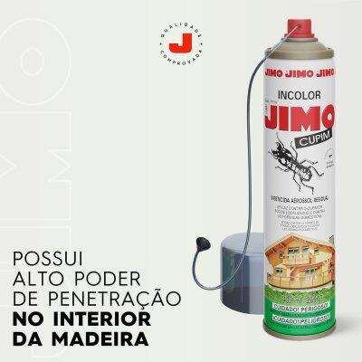 JIMO CUPIM AEROSSOL RESIDUAL é um inseticida pronto para o uso e com alto poder residual, que combate os focos localizados de cupins e brocas em pequenas peças de madeira. JIMO CUPIM AEROSSOL RESIDUAL possui alto poder de penetração, atingindo cupins e brocas no interior da madeira. Possui um tubo flexível, munido de uma agulha injetora e de um protetor antirrefluxo, que evita respingos durante a aplicação.