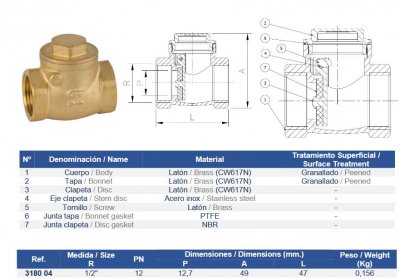 | 3180 04 | VALVULA RETENCAO HORIZONTAL EM LATAO BSP VEDACAO NBR 1/2" | 20 | 0.157 | 20/120 |