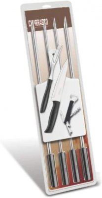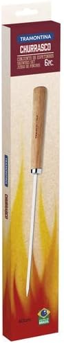 As lâminas em aço inox contam com uma estampagem especial que evita deformações, garantindo que o espeto permaneça firme mesmo com cortes mais pesados. O cabo em madeira natural oferece um manuseio confortável e seguro, agregando aquele toque rústico e autêntico ao seu kit de churrasqueiro.