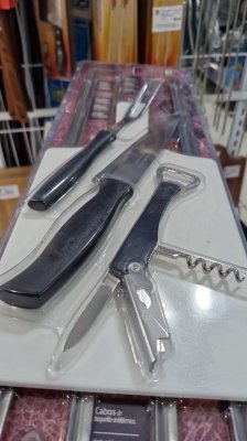 Material dos Cabos: Baquelite (espetos), Polipropileno (garfo/faca) e ABS (abridor)