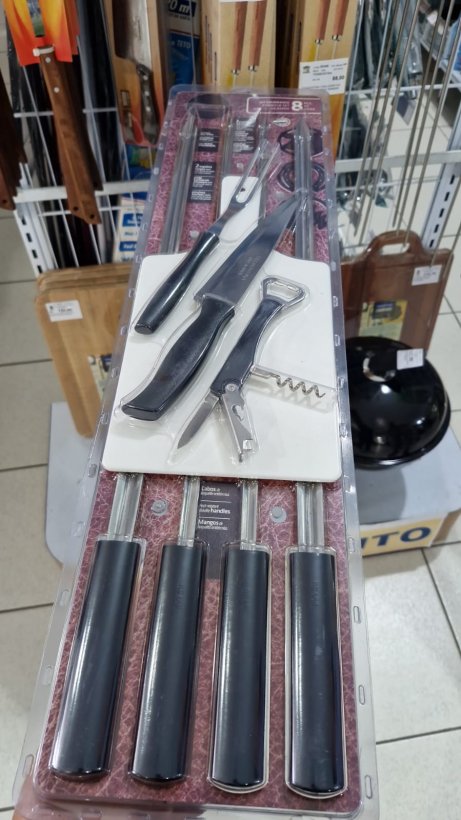 Este kit combina a durabilidade do aço inox com a segurança dos cabos antitérmicos em baquelite e polipropileno. Além dos espetos de diferentes tamanhos, o conjunto conta com uma tábua prática e um abridor de garrafas, garantindo que você tenha tudo à mão para servir com excelência.