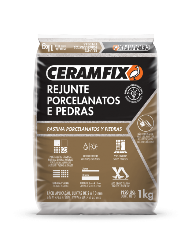 O Rejunte Porcelanatos e Pedras Ceramfix foi especialmente desenvolvido para o rejuntamento de porcelanatos, mármores, granitos e cerâmicas retificadas, com juntas de 2 a 10 mm. Resistente a fungos e mofos, este produto oferece fácil aplicação e um acabamento extra liso. Destaca-se por sua excelente aderência, resistência mecânica e flexibilidade. Livre de areia em sua composição, proporciona um acabamento suave, com cores uniformes e duradouras.