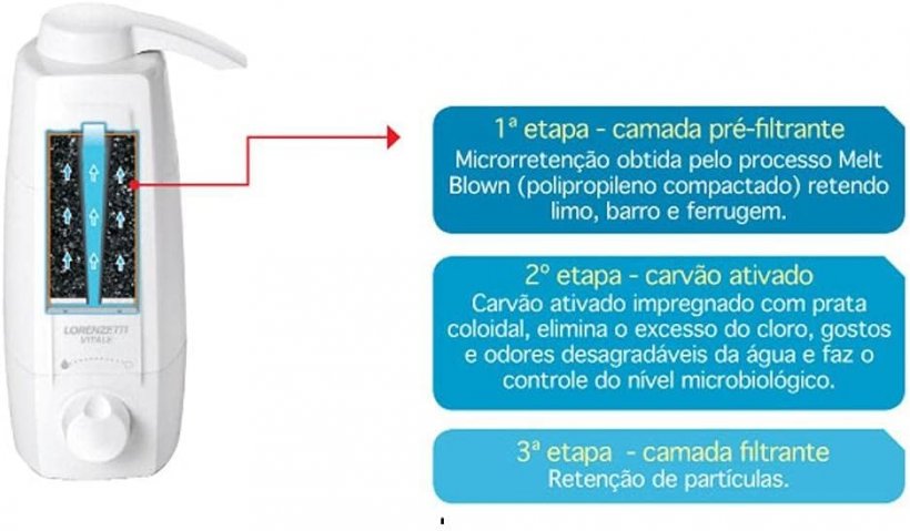 O Purificador de Água Vitale possui um design moderno e compacto. O seu eficiente processo de purificação que compõe 3 etapas, elimina partículas sólidas como barro, limo e ferrugem, o excesso de cloro, gostos e odores desagradáveis da água e evita a proliferação de bactérias, proporcionando uma água saudável e cristalina para toda a família. Capacidade de purificação 1000 Litros.