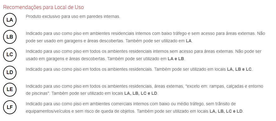 LE- Indicado para uso como piso em todos os ambientes residenciais. Pode ser utilizado em áreas molhadas e áreas descobertas. Também pode ser utilizado em locais LA, LB, LC e LD.