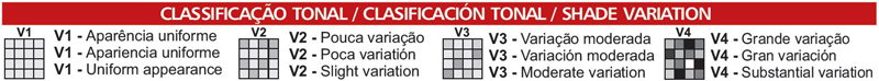 Algumas referências têm variações propositais de tons e de desenhos. Produtos com decoração HD podem ser compostos de várias faces, onde as peças são propositalmente diferentes para simular o efeito de pedra, madeira, mármore ou de qualquer superfície natural, por isso no assentamento não organize as faces, assente de forma aleatoriamente. Para mais informações verifique a classificação tonal do produto através dos padrões V1 a V4.