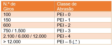 (*) Corpo de prova deve passar pelo ensaio especificado na IS0 10545-14 para resistência ao manchamento