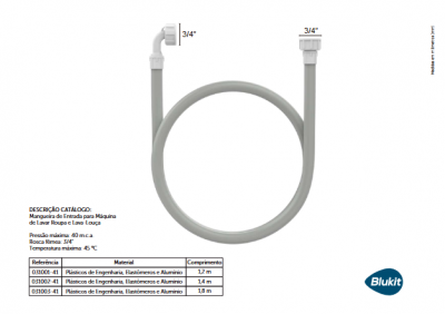 Mangueira de Entrada para Máquina de Lavar Blukit faz a conexão de entrada de água para abastecer a máquina de lavar roupa e louça. De um lado temos o terminal em 90º é possível fazer a instalação o mais próximo possível da parede poupando espaço. Do outro lado temos o terminal com a porca anti torção que permite uma instalação fácil e prática. A mangueira resiste a pressão de até 40 m.c.a e suporta a temperatura máxima de água de até 45ºC.