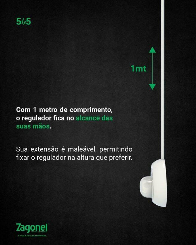 Sua extensão é maleável, permitindo fixar o regulador na altura que preferir.