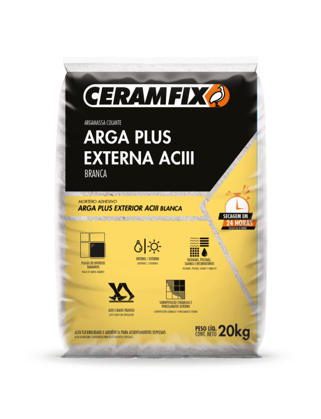 A Arga Plus Externa ACIII Ceramfix destaca-se como uma argamassa colante especialmente recomendada para assentamentos especiais que demandam elevada aderência, resistência mecânica e flexibilidade. Classificada como ACIII D conforme a ABNT NBR 14081-1, esta argamassa atende a critérios rigorosos de qualidade e desempenho, garantindo sua adequação a projetos que exigem características excepcionais.