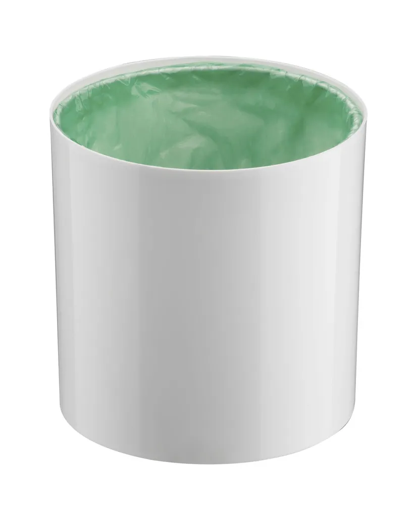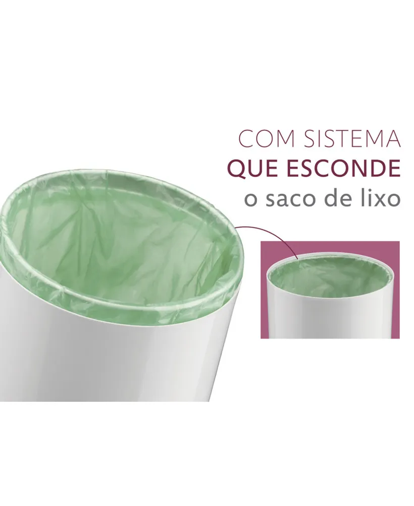 A lixeira tem capacidade para 5l. com tampa removível, fica fácil trocar o saquinho de lixo, além de deixá-lo fixo e escondido sob a borda da tampa.
