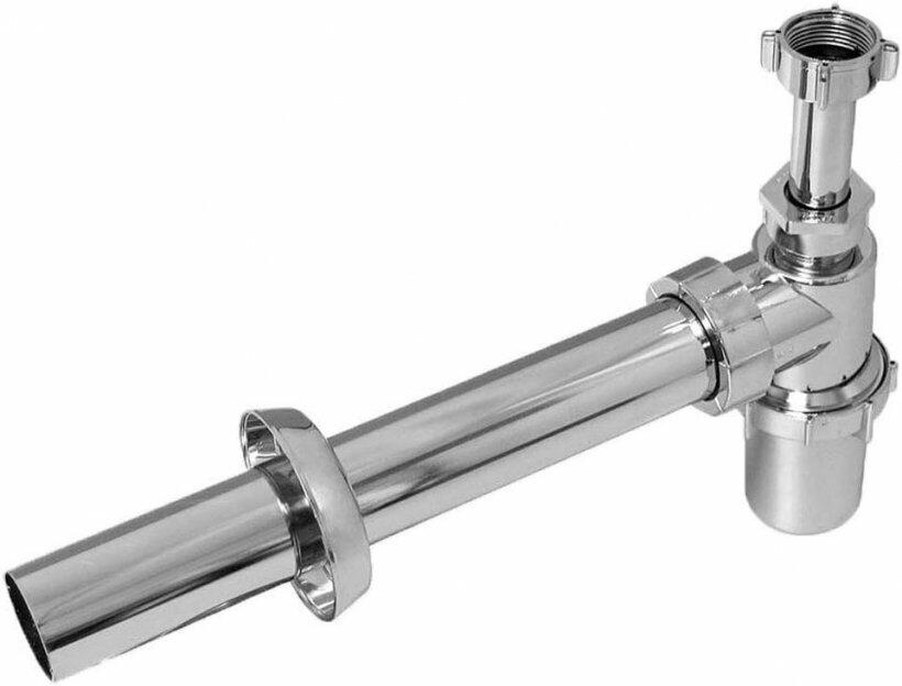 Sifão com tubulação de saída rígida e com regulagem de altura entre a válvula da pia e a saída para esgoto, impedindo o retorno do mau cheiro da tubulação de esgoto.